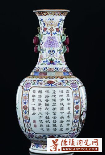 圖2清乾隆青花粉彩纏枝花卉開光梅菊圖御制詩文柿蒂耳瓶,則是糅合了大清盛世最高超的藝術(shù)因素——御窯廠的制瓷圣手、宮廷畫院的杰出粉本、國內(nèi)頂級的青料粉彩的罕見精品。最令其身價(jià)倍增的是乾隆皇帝親作的兩首御制詩——詠梅詩、詠菊詩。梅花和菊花都是雍正、乾隆這對父子帝王的鐘愛之物,在兩朝的瓷胎畫琺瑯器上曾大量采用。晚年的乾隆皇帝深深陶醉于自己的文治武功中,在志得意滿之余,便將更多的精力投注于平生所追求的藝術(shù)享受中,帝王喜愛的詩作與景物便自然出現(xiàn)在帝王晨星把玩的風(fēng)雅之物上。從目前傳世的乾隆朝御瓷看,書寫乾隆皇帝御制詩文多見三清詩茶具和各式壁瓶兩類,除此之外,還有極少數(shù)的文房和陳設(shè)器。這些帶有御題詩文的器物,特別是其中的陳設(shè)器,數(shù)量罕少,制作尤精,無疑是常伴君王并深受垂愛的心頭之物。