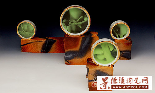 在此之后,他相繼在2007年、2008年創(chuàng)作《電視機(jī)——愛(ài)語(yǔ)系列》、《手機(jī)——愛(ài)語(yǔ)系列》、有關(guān)情色題材的陶藝作品,此系列作品造型選取日常生活中電視機(jī)、手機(jī)造型,源于它們是當(dāng)今傳播情色文化信息的重要圖像媒介,大量傳遞給我們的東西:名與利的功利價(jià)值觀、情與色的裸露彌漫生活觀,瓦解和踐踏人們的傳統(tǒng)倫理道德觀。像《電視機(jī)——愛(ài)語(yǔ)系列》陶藝作品,吸取當(dāng)代卡通文化時(shí)尚元素,有意識(shí)在造型形態(tài)設(shè)計(jì)為天真可愛(ài),富有審美時(shí)尚情趣,主色調(diào)采用充滿幻想浪漫的果綠色與粉紅色,屏幕內(nèi)主題畫(huà)面以人物接吻特寫(xiě)鏡頭角度,通過(guò)卡通插畫(huà)表現(xiàn)形式釉上彩繪,邊沿部分搭配鮮艷斑斕蝴蝶,突出主題畫(huà)面的情色視覺(jué)的感官效應(yīng),營(yíng)造刺激暖的誘惑氛圍,彌漫赤裸色情的性幻想之意,揭示人性本性的另一面。還有作品《手機(jī)——愛(ài)語(yǔ)系列》,著力把手機(jī)與安全套兩者造型融為一體,轉(zhuǎn)變成充滿情欲與性愛(ài)幻想的時(shí)尚手機(jī),屏幕畫(huà)面內(nèi)釉上彩繪裝飾著擺弄各種色情引誘的女性姿態(tài),諷刺當(dāng)下社會(huì)的情色環(huán)境與人性情欲的貪婪本性現(xiàn)象。