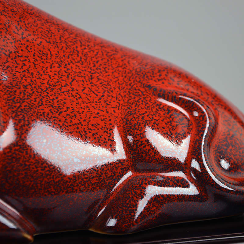 《開運(yùn)紅?!飞ご傻裣抵袊沾稍O(shè)計(jì)藝術(shù)大師劉少平先生新年力作。ニ0二一年為辛丑年,即民間俗稱牛年。為策應(yīng)民眾新春賀歲之需,大師以其擅長的瓷塑造型技能,嫻熟而生動地塑造出健牛靜臥如山的瞬間情態(tài)。其刀刻線條,筆不暢而意;線型粗短,隨牛的體態(tài)結(jié)構(gòu)而起伏變化,準(zhǔn)確表達(dá)出健牛粗厚的毛皮、勁健的筋肉質(zhì)感和溫厚老成的性格。在條組合上形成強(qiáng)烈的形式美感。兼之以高溫色釉面敷彩,濃烈而氣生,厚重而溢韻。觀之下,恍若能觸牛之毛汗之氣,能聞牛之喘息之聲。大師用簡明扼要的瓷雕藝術(shù)語言和穩(wěn)宜的色彩語匯所表述的動物造形方法,是景德鎮(zhèn)陶瓷雕塑行業(yè)中頗為少見的典型樣式,是謂中生代大師輩中難得的精品力作之一。